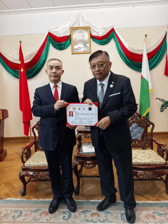 在这个全球化的时代,文化的交流与融合成为了连接不同国家和地区人民心灵的桥梁。为了促进中马两国之间的文化理解和友谊深化,马达加斯加共和国驻华大使馆授予文国红主席“马达加斯加共和国驻华大使馆特邀文化交流使者”称号,罗班松·让·路易大使向文国红主席颁发了证书。文国红主席欣然接受并表示感谢。