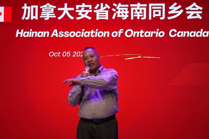 加拿大海南排球俱乐部负责人曾广坚也上台发言,介绍了俱乐部的活动和愿景 。 他说:“ 排球是海南人的传统运动,我们要在加拿大继续传承和发展 。 感谢大家一路支持 。”